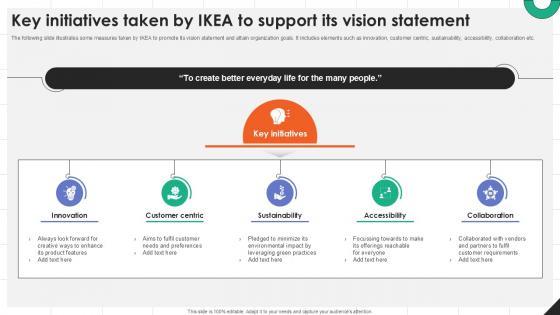 The following slide illustrates some measures taken by IKEA to promote its vision statement and attain organization goals. It includes elements such as innovation, customer centric, sustainability, accessibility, collaboration etc. Do you have an important presentation coming up Are you looking for something that will make your presentation stand out from the rest Look no further than Key Initiatives Taken By IKEA To Support Its Vision Statement PPT Slide Strategy SS V. With our professional designs, you can trust that your presentation will pop and make delivering it a smooth process. And with Slidegeeks, you can trust that your presentation will be unique and memorable. So why wait Grab Key Initiatives Taken By IKEA To Support Its Vision Statement PPT Slide Strategy SS V today and make your presentation stand out from the rest The following slide illustrates some measures taken by IKEA to promote its vision statement and attain organization goals. It includes elements such as innovation, customer centric, sustainability, accessibility, collaboration etc.