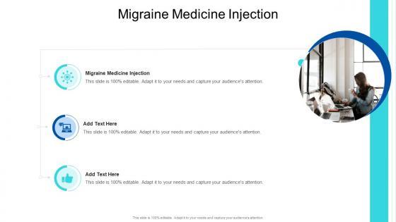 Introducing our well designed Migraine Medicine Injection In Powerpoint And Google Slides Cpb. This PowerPoint design presents information on topics like Migraine Medicine Injection. As it is predesigned it helps boost your confidence level. It also makes you a better presenter because of its high quality content and graphics. This PPT layout can be downloaded and used in different formats like PDF, PNG, and JPG. Not only this, it is available in both Standard Screen and Widescreen aspect ratios for your convenience. Therefore, click on the download button now to persuade and impress your audience. Our Migraine Medicine Injection In Powerpoint And Google Slides Cpb are topically designed to provide an attractive backdrop to any subject. Use them to look like a presentation pro.