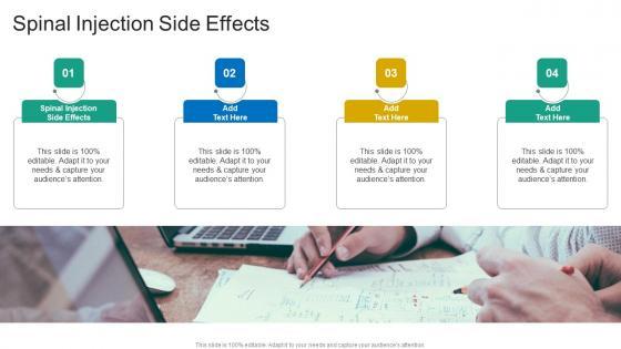 Introducing our well designed Spinal Injection Side Effects In Powerpoint And Google Slides Cpb. This PowerPoint design presents information on topics like Spinal Injection Side Effects. As it is predesigned it helps boost your confidence level. It also makes you a better presenter because of its high quality content and graphics. This PPT layout can be downloaded and used in different formats like PDF, PNG, and JPG. Not only this, it is available in both Standard Screen and Widescreen aspect ratios for your convenience. Therefore, click on the download button now to persuade and impress your audience. Our Spinal Injection Side Effects In Powerpoint And Google Slides Cpb are topically designed to provide an attractive backdrop to any subject. Use them to look like a presentation pro.