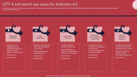 This slide showcases how manufacturers can leverage GPT 4 technology to augment and enhance industry 4.0 tasks. It provides details about predicting problems, data monitoring, production assistance, human machine interface, etc. Want to ace your presentation in front of a live audience Our GPT 4 Advanced Use Cases GPT 4 Revolutionary Generative AI Innovation Brochure Pdf can help you do that by engaging all the users towards you. Slidegeeks experts have put their efforts and expertise into creating these impeccable powerpoint presentations so that you can communicate your ideas clearly. Moreover, all the templates are customizable, and easy to edit and downloadable. Use these for both personal and commercial use. This slide showcases how manufacturers can leverage GPT 4 technology to augment and enhance industry 4.0 tasks. It provides details about predicting problems, data monitoring, production assistance, human machine interface, etc.