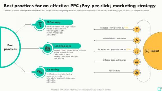This slides showcases the best practices for an effective PPC Pay-per-click marketing strategy. It includes best practices such as develop PPC Ad copy, create landing pages , AB testing and its impact on business. There are so many reasons you need a Best Practices For An Effective PPC Pay Per Innovative Tactics For Revving Up Strategy SS. The first reason is you can not spend time making everything from scratch, Thus, Slidegeeks has made presentation templates for you too. You can easily download these templates from our website easily. This slides showcases the best practices for an effective PPC Pay-per-click marketing strategy. It includes best practices such as develop PPC Ad copy, create landing pages , AB testing and its impact on business.