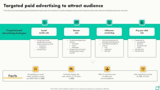 This slide showcases targeting paid advertising technique to gain more audience. It includes strategies such as social media ads, banner ads, influencer marketing and pay-per-clicks ads. Presenting this PowerPoint presentation, titled Targeted Paid Advertising To Attract Audience Innovative Tactics For Revving Up Strategy SS, with topics curated by our researchers after extensive research. This editable presentation is available for immediate download and provides attractive features when used. Download now and captivate your audience. Presenting this Targeted Paid Advertising To Attract Audience Innovative Tactics For Revving Up Strategy SS. Our researchers have carefully researched and created these slides with all aspects taken into consideration. This is a completely customizable Targeted Paid Advertising To Attract Audience Innovative Tactics For Revving Up Strategy SS that is available for immediate downloading. Download now and make an impact on your audience. Highlight the attractive features available with our PPTs. This slide showcases targeting paid advertising technique to gain more audience. It includes strategies such as social media ads, banner ads, influencer marketing and pay-per-clicks ads.