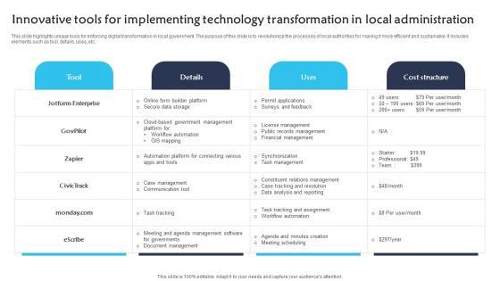 This slide highlights unique tools for enforcing digital transformation in local government. The purpose of this slide is to revolutionize the processes of local authorities for making it more efficient and sustainable. It includes elements such as tool, details, uses, etc. Showcasing this set of slides titled Innovative Tools For Implementing Technology Transformation In Local Administration Pictures pdf. The topics addressed in these templates are Tool, Details, Uses, Cost Structure. All the content presented in this PPT design is completely editable. Download it and make adjustments in color, background, font etc. as per your unique business setting. This slide highlights unique tools for enforcing digital transformation in local government. The purpose of this slide is to revolutionize the processes of local authorities for making it more efficient and sustainable. It includes elements such as tool, details, uses, etc.