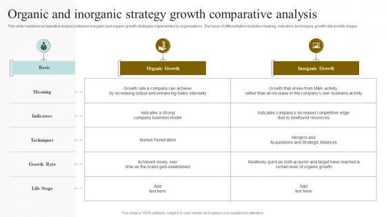 This slide mentions comparative analysis between inorganic and organic growth strategies implemented by organizations. The basis of differentiation includes meaning, indicators, techniques, growth rate and life stages. Pitch your topic with ease and precision using this Organic And Inorganic Strategy Growth Comparative Analysis Brochure Pdf. This layout presents information on Organic Growth, Analysis, Organic. It is also available for immediate download and adjustment. So, changes can be made in the color, design, graphics or any other component to create a unique layout. This slide mentions comparative analysis between inorganic and organic growth strategies implemented by organizations. The basis of differentiation includes meaning, indicators, techniques, growth rate and life stages.