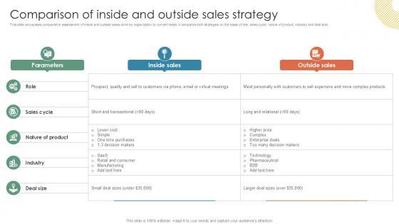 This slide showcases comparative assessment of inside and outside sales done by organization to convert leads. It compares both strategies on the basis of role, sales cycle, nature of product, industry and deal size. From laying roadmaps to briefing everything in detail, our templates are perfect for you. You can set the stage with your presentation slides. All you have to do is download these easy-to-edit and customizable templates. Comparison Of Inside And Outside Sales Strategy PPT Template Strategy SS V will help you deliver an outstanding performance that everyone would remember and praise you for. Do download this presentation today. This slide showcases comparative assessment of inside and outside sales done by organization to convert leads. It compares both strategies on the basis of role, sales cycle, nature of product, industry and deal size