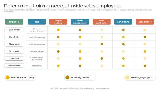 Thus slides showcases identification of training need of different inside sales employees for improving the lead generation process. It categories employees into three training categories that are need extensive training, no training needed and need ongoing support. Find highly impressive Determining Training Need Of Inside Vs Outside Sales PPT Example Strategy SS V on Slidegeeks to deliver a meaningful presentation. You can save an ample amount of time using these presentation templates. No need to worry to prepare everything from scratch because Slidegeeks experts have already done a huge research and work for you. You need to download Determining Training Need Of Inside Vs Outside Sales PPT Example Strategy SS V for your upcoming presentation. All the presentation templates are 100 percent editable and you can change the color and personalize the content accordingly. Download now Thus slides showcases identification of training need of different inside sales employees for improving the lead generation process. It categories employees into three training categories that are need extensive training, no training needed and need ongoing support
