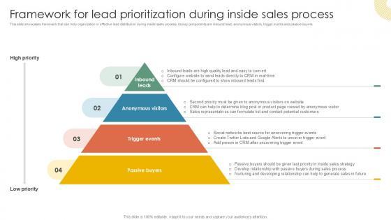 This slide showcases framework that can help organization in effective lead distribution during inside sales process. Its key components are inbound lead, anonymous visitors, trigger events and passive buyers. If you are looking for a format to display your unique thoughts, then the professionally designed Framework For Lead Prioritization Inside Vs Outside Sales PPT PowerPoint Strategy SS V is the one for you. You can use it as a Google Slides template or a PowerPoint template. Incorporate impressive visuals, symbols, images, and other charts. Modify or reorganize the text boxes as you desire. Experiment with shade schemes and font pairings. Alter, share or cooperate with other people on your work. Download Framework For Lead Prioritization Inside Vs Outside Sales PPT PowerPoint Strategy SS V and find out how to give a successful presentation. Present a perfect display to your team and make your presentation unforgettable. This slide showcases framework that can help organization in effective lead distribution during inside sales process. Its key components are inbound lead, anonymous visitors, trigger events and passive buyers