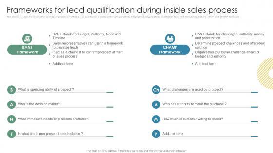 This slide showcases frameworks that can help organization in effective lead qualification to increase the sales probability, It highlights two types of lead qualification framework for business that are BANT and CHAMP framework. Are you in need of a template that can accommodate all of your creative concepts This one is crafted professionally and can be altered to fit any style. Use it with Google Slides or PowerPoint. Include striking photographs, symbols, depictions, and other visuals. Fill, move around, or remove text boxes as desired. Test out color palettes and font mixtures. Edit and save your work, or work with colleagues. Download Frameworks For Lead Qualification During Inside Vs Outside Sales PPT Example Strategy SS V and observe how to make your presentation outstanding. Give an impeccable presentation to your group and make your presentation unforgettable. This slide showcases frameworks that can help organization in effective lead qualification to increase the sales probability, It highlights two types of lead qualification framework for business that are BANT and CHAMP framework