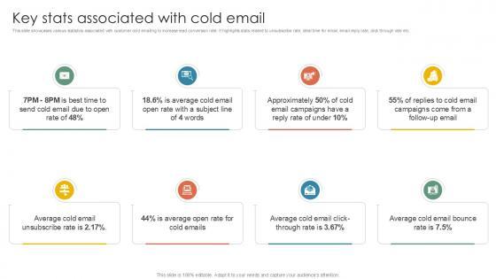 This slide showcases various statistics associated with customer cold emailing to increase lead conversion rate. It highlights stats related to unsubscribe rate, ideal time for email, email reply rate, click through rate etc. Welcome to our selection of the Key Stats Associated With Cold Email Inside Vs Outside Sales PPT Example Strategy SS V. These are designed to help you showcase your creativity and bring your sphere to life. Planning and Innovation are essential for any business that is just starting out. This collection contains the designs that you need for your everyday presentations. All of our PowerPoints are 100Percent editable, so you can customize them to suit your needs. This multi-purpose template can be used in various situations. Grab these presentation templates today. This slide showcases various statistics associated with customer cold emailing to increase lead conversion rate. It highlights stats related to unsubscribe rate, ideal time for email, email reply rate, click through rate etc.