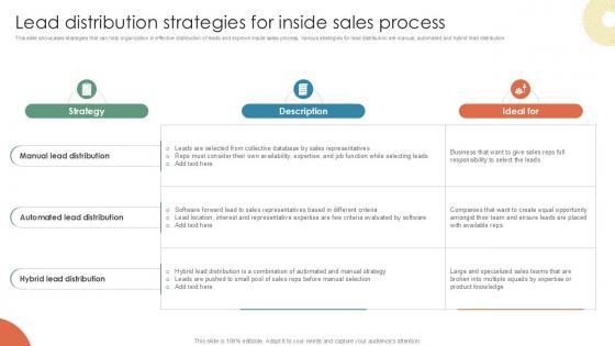 This slide showcases strategies that can help organization in effective distribution of leads and improve inside sales process. Various strategies for lead distribution are manual, automated and hybrid lead distribution. The Lead Distribution Strategies For Inside Vs Outside Sales PPT Sample Strategy SS V is a compilation of the most recent design trends as a series of slides. It is suitable for any subject or industry presentation, containing attractive visuals and photo spots for businesses to clearly express their messages. This template contains a variety of slides for the user to input data, such as structures to contrast two elements, bullet points, and slides for written information. Slidegeeks is prepared to create an impression. This slide showcases strategies that can help organization in effective distribution of leads and improve inside sales process. Various strategies for lead distribution are manual, automated and hybrid lead distribution