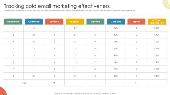 This showcases tracking sheet that can help organization analyze the effectiveness of cold email strategy. Its key elements are email touch, connected, bounced, open rate, replied and adjusted response rate. Do you have an important presentation coming up Are you looking for something that will make your presentation stand out from the rest Look no further than Tracking Cold Email Marketing Inside Vs Outside Sales PPT Template Strategy SS V. With our professional designs, you can trust that your presentation will pop and make delivering it a smooth process. And with Slidegeeks, you can trust that your presentation will be unique and memorable. So why wait Grab Tracking Cold Email Marketing Inside Vs Outside Sales PPT Template Strategy SS V today and make your presentation stand out from the rest This showcases tracking sheet that can help organization analyze the effectiveness of cold email strategy. Its key elements are email touch, connected, bounced, open rate, replied and adjusted response rate