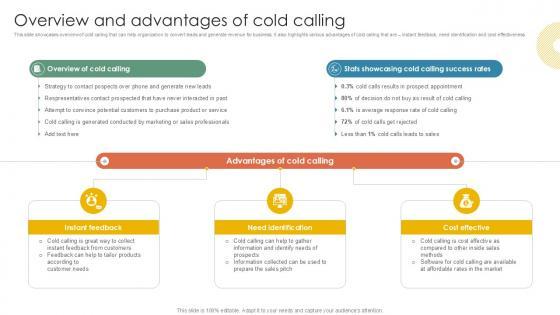 This slide showcases overview of cold calling that can help organization to convert leads and generate revenue for business. It also highlights various advantages of cold calling that are instant feedback, need identification and cost effectiveness. Retrieve professionally designed Overview And Advantages Of Cold Calling Inside Vs Outside Sales PPT Slide Strategy SS V to effectively convey your message and captivate your listeners. Save time by selecting pre-made slideshows that are appropriate for various topics, from business to educational purposes. These themes come in many different styles, from creative to corporate, and all of them are easily adjustable and can be edited quickly. Access them as PowerPoint templates or as Google Slides themes. You do not have to go on a hunt for the perfect presentation because Slidegeeks got you covered from everywhere. This slide showcases overview of cold calling that can help organization to convert leads and generate revenue for business. It also highlights various advantages of cold calling that are instant feedback, need identification and cost effectiveness