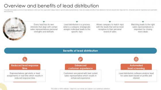 This slide showcases overview of lead distribution which can help organization assign leads to specific sales representatives. It also showcases benefits of lead distribution that are reduced lead response time, enhanced customer experience and automated lead screening. Here you can discover an assortment of the finest PowerPoint and Google Slides templates. With these templates, you can create presentations for a variety of purposes while simultaneously providing your audience with an eye-catching visual experience. Download Overview And Benefits Of Lead Distribution Inside Vs Outside Sales PPT Slide Strategy SS V to deliver an impeccable presentation. These templates will make your job of preparing presentations much quicker, yet still, maintain a high level of quality. Slidegeeks has experienced researchers who prepare these templates and write high-quality content for you. Later on, you can personalize the content by editing the Overview And Benefits Of Lead Distribution Inside Vs Outside Sales PPT Slide Strategy SS V. This slide showcases overview of lead distribution which can help organization assign leads to specific sales representatives. It also showcases benefits of lead distribution that are reduced lead response time, enhanced customer experience and automated lead screening