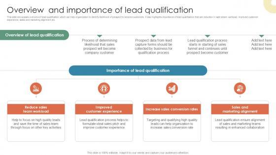 This slide showcases overview of lead qualification which can help organization to identify likelihood of prospect to become customers. It also highlights importance of lead qualification that are reduction in sale steam workload, improved customer experience, sales and marketing alignment etc.Take your projects to the next level with our ultimate collection of Overview And Importance Of Lead Inside Vs Outside Sales PPT Presentation Strategy SS V. Slidegeeks has designed a range of layouts that are perfect for representing task or activity duration, keeping track of all your deadlines at a glance. Tailor these designs to your exact needs and give them a truly corporate look with your own brand colors they will make your projects stand out from the rest This slide showcases overview of lead qualification which can help organization to identify likelihood of prospect to become customers. It also highlights importance of lead qualification that are reduction in sale steam workload, improved customer experience, sales and marketing alignment etc.