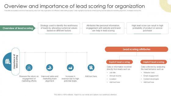 This slide showcases overview of lead scoring which can help organization for effective inside sales process. It also highlights importance of lead scoring that are sales and marketing alignment, increased revenue etc. Do you know about Slidesgeeks Overview And Importance Of Lead Scoring Inside Vs Outside Sales PPT Presentation Strategy SS V These are perfect for delivering any kind od presentation. Using it, create PowerPoint presentations that communicate your ideas and engage audiences. Save time and effort by using our pre-designed presentation templates that are perfect for a wide range of topic. Our vast selection of designs covers a range of styles, from creative to business, and are all highly customizable and easy to edit. Download as a PowerPoint template or use them as Google Slides themes. This slide showcases overview of lead scoring which can help organization for effective inside sales process. It also highlights importance of lead scoring that are sales and marketing alignment, increased revenue etc.