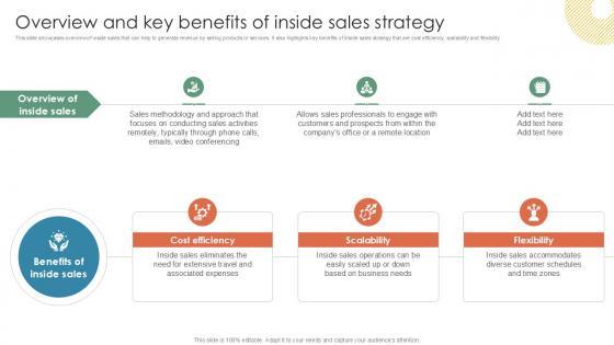 This slide showcases overview of inside sales that can help to generate revenue by selling products or services. It also highlights key benefits of inside sales strategy that are cost efficiency, scalability and flexibility. Create an editable Remote Sales Plan For Overview And Key Benefits Of Inside Sales Strategy SS V that communicates your idea and engages your audience. Whether you are presenting a business or an educational presentation, pre-designed presentation templates help save time. Remote Sales Plan For Overview And Key Benefits Of Inside Sales Strategy SS V is highly customizable and very easy to edit, covering many different styles from creative to business presentations. Slidegeeks has creative team members who have crafted amazing templates. So, go and get them without any delay. This slide showcases overview of inside sales that can help to generate revenue by selling products or services. It also highlights key benefits of inside sales strategy that are cost efficiency, scalability and flexibility.