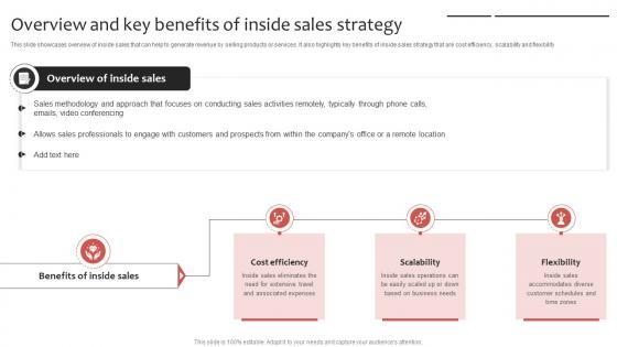 This slide showcases overview of inside sales that can help to generate revenue by selling products or services. It also highlights key benefits of inside sales strategy that are cost efficiency, scalability and flexibility. Find a pre-designed and impeccable Overview And Key Benefits Of Inside Vs Outside Sales PPT Slide Strategy SS V. The templates can ace your presentation without additional effort. You can download these easy-to-edit presentation templates to make your presentation stand out from others. So, what are you waiting for Download the template from Slidegeeks today and give a unique touch to your presentation. This slide showcases overview of inside sales that can help to generate revenue by selling products or services. It also highlights key benefits of inside sales strategy that are cost efficiency, scalability and flexibility