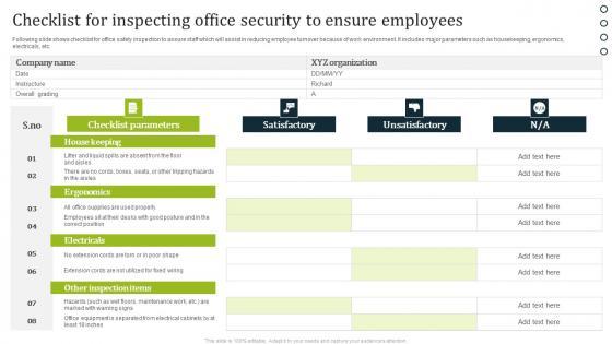 Following slide shows checklist for office safety inspection to assure staff which will assist in reducing employee turnover because of work environment. It includes major parameters such as housekeeping, ergonomics, electricals, etc. Showcasing this set of slides titled Checklist For Inspecting Office Security To Ensure Employees Portrait Pdf. The topics addressed in these templates are Satisfactory, Unsatisfactory, Checklist Parameters. All the content presented in this PPT design is completely editable. Download it and make adjustments in color, background, font etc. as per your unique business setting. Following slide shows checklist for office safety inspection to assure staff which will assist in reducing employee turnover because of work environment. It includes major parameters such as housekeeping, ergonomics, electricals, etc.