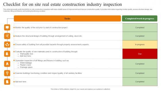 This slide represents audit checklist for on site construction inspection with helps identify areas of improvement and improve construction quality. It provides information regarding monitor quality, assess structure design, raw materials, fitting and fixtures and building functioning condition. Pitch your topic with ease and precision using this Checklist For On Site Real Estate Construction Industry Inspection Topics Pdf. This layout presents information on Tasks, Work In Progress. It is also available for immediate download and adjustment. So, changes can be made in the color, design, graphics or any other component to create a unique layout. This slide represents audit checklist for on site construction inspection with helps identify areas of improvement and improve construction quality. It provides information regarding monitor quality, assess structure design, raw materials, fitting and fixtures and building functioning condition.
