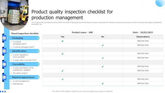 This slide provides glimpse about inspection checklist for high quality production that can help an organization to effective production planning and control. It includes packaging, identification, traceability, etc. If your project calls for a presentation, then Slidegeeks is your go to partner because we have professionally designed, easy to edit templates that are perfect for any presentation. After downloading, you can easily edit Product Quality Inspection Checklist For Production Management Formats PDF and make the changes accordingly. You can rearrange slides or fill them with different images. Check out all the handy templates.