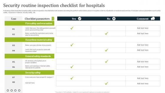 Following slide shows the hospital safety routine inspection checklist which will assist in recording the perform action taken place in hospitals in terms of patients or medicine and services. It includes various parameters such as fire safety, hazardous material, security safety, etc. Showcasing this set of slides titled Security Routine Inspection Checklist For Hospitals Diagrams Pdf. The topics addressed in these templates are Checklist Parameters, Comment. All the content presented in this PPT design is completely editable. Download it and make adjustments in color, background, font etc. as per your unique business setting. Following slide shows the hospital safety routine inspection checklist which will assist in recording the perform action taken place in hospitals in terms of patients or medicine and services. It includes various parameters such as fire safety, hazardous material, security safety, etc.