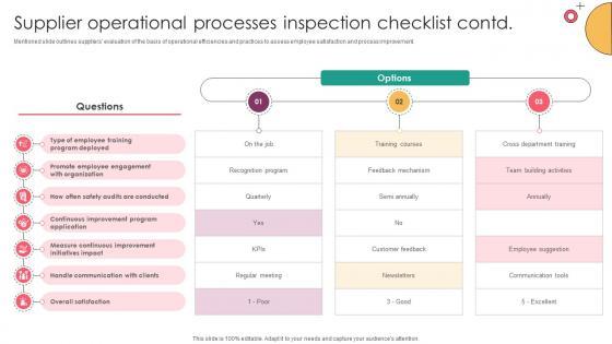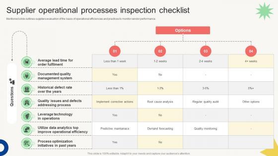 Mentioned slide outlines suppliers evaluation of the basis of operational efficiencies and practices to monitor vendor performance. Presenting this PowerPoint presentation, titled Strategic Supplier Evaluation Supplier Operational Processes Inspection Checklist, with topics curated by our researchers after extensive research. This editable presentation is available for immediate download and provides attractive features when used. Download now and captivate your audience. Presenting this Strategic Supplier Evaluation Supplier Operational Processes Inspection Checklist. Our researchers have carefully researched and created these slides with all aspects taken into consideration. This is a completely customizable Strategic Supplier Evaluation Supplier Operational Processes Inspection Checklist that is available for immediate downloading. Download now and make an impact on your audience. Highlight the attractive features available with our PPTs. Mentioned slide outlines suppliers evaluation of the basis of operational efficiencies and practices to monitor vendor performance.