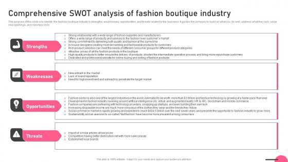 The purpose of this slide is to identify the fashion boutique industrys strengths, weaknesses, opportunities, and threats related to the business. It guides the company to build on what you do well, address what they lack, seize new openings, and minimize risks. Get a simple yet stunning designed Comprehensive Swot Analysis Of Fashion Boutique Industry Boutique Business Inspiration Pdf. It is the best one to establish the tone in your meetings. It is an excellent way to make your presentations highly effective. So, download this PPT today from Slidegeeks and see the positive impacts. Our easy-to-edit Comprehensive Swot Analysis Of Fashion Boutique Industry Boutique Business Inspiration Pdf can be your go-to option for all upcoming conferences and meetings. So, what are you waiting for Grab this template today. The purpose of this slide is to identify the fashion boutique industrys strengths, weaknesses, opportunities, and threats related to the business. It guides the company to build on what you do well, address what they lack, seize new openings, and minimize risks.
