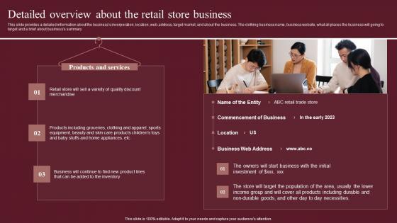 This slide provides a detailed information about the businesss incorporation, location, web-address, target market, and about the business. The clothing business name, business website, what all places the business will going to target and a brief about businesss summary. Whether you have daily or monthly meetings, a brilliant presentation is necessary. Detailed Overview About The Retail Store Business Fashion Business Plan Inspiration Pdf can be your best option for delivering a presentation. Represent everything in detail using Detailed Overview About The Retail Store Business Fashion Business Plan Inspiration Pdf and make yourself stand out in meetings. The template is versatile and follows a structure that will cater to your requirements. All the templates prepared by Slidegeeks are easy to download and edit. Our research experts have taken care of the corporate themes as well. So, give it a try and see the results. This slide provides a detailed information about the businesss incorporation, location, web-address, target market, and about the business. The clothing business name, business website, what all places the business will going to target and a brief about businesss summary.