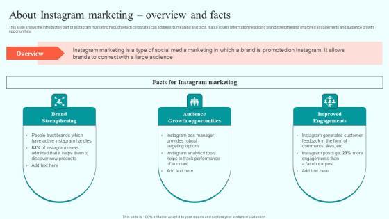 This slide shows the introductory part of Instagram marketing through which corporates can address its meaning and facts. It also covers information regrading brand strengthening, improved engagements and audience growth opportunities. Create an editable About Instagram Marketing Overview And Facts Online Advertising Solutions Themes Pdf that communicates your idea and engages your audience. Whether you are presenting a business or an educational presentation, pre-designed presentation templates help save time. About Instagram Marketing Overview And Facts Online Advertising Solutions Themes Pdf is highly customizable and very easy to edit, covering many different styles from creative to business presentations. Slidegeeks has creative team members who have crafted amazing templates. So, go and get them without any delay. This slide shows the introductory part of Instagram marketing through which corporates can address its meaning and facts. It also covers information regrading brand strengthening, improved engagements and audience growth opportunities.