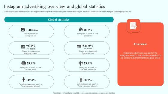 This slide shows key statistics related to Instagram advertising which can be used by corporates to draw insights. It includes potential reach of ads, change in ad reach per quarter, etc. Find highly impressive Social Media Marketing To Enhance Instagram Advertising Overview And Global Statistics MKT SS V on Slidegeeks to deliver a meaningful presentation. You can save an ample amount of time using these presentation templates. No need to worry to prepare everything from scratch because Slidegeeks experts have already done a huge research and work for you. You need to download Social Media Marketing To Enhance Instagram Advertising Overview And Global Statistics MKT SS V for your upcoming presentation. All the presentation templates are 100 percent editable and you can change the color and personalize the content accordingly. Download now This slide shows key statistics related to Instagram advertising which can be used by corporates to draw insights. It includes potential reach of ads, change in ad reach per quarter, etc.