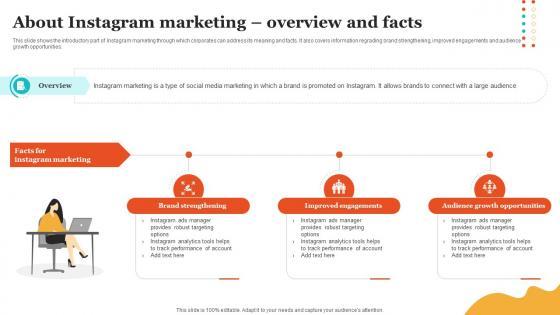 This slide shows the introductory part of Instagram marketing through which corporates can address its meaning and facts. It also covers information regrading brand strengthening, improved engagements and audience growth opportunities. Create an editable About Instagram Marketing Overview And Facts Online Advertising Solutions Themes Pdf that communicates your idea and engages your audience. Whether you are presenting a business or an educational presentation, pre-designed presentation templates help save time. About Instagram Marketing Overview And Facts Online Advertising Solutions Themes Pdf is highly customizable and very easy to edit, covering many different styles from creative to business presentations. Slidegeeks has creative team members who have crafted amazing templates. So, go and get them without any delay. This slide shows the introductory part of Instagram marketing through which corporates can address its meaning and facts. It also covers information regrading brand strengthening, improved engagements and audience growth opportunities.