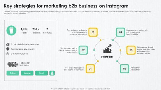 This slide showcases various strategies which can be used in successful marketing of business on Instagram. It includes elements such as unique hashtags, customer testimonials, organic search volume, host giveaways, engagement, brand credibility etc. From laying roadmaps to briefing everything in detail, our templates are perfect for you. You can set the stage with your presentation slides. All you have to do is download these easy-to-edit and customizable templates. B2B Marketing Techniques Key Strategies For Marketing B2B Business On Instagram will help you deliver an outstanding performance that everyone would remember and praise you for. Do download this presentation today. This slide showcases various strategies which can be used in successful marketing of business on Instagram. It includes elements such as unique hashtags, customer testimonials, organic search volume, host giveaways, engagement, brand credibility etc.