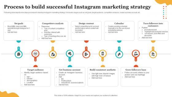 Following slide depicts nine steps procedure which can be used by marketers to develop Instagram marketing strategy for products. It includes stages such as set goals, target audience, competitors analysis, create business account, etc. Create an editable Marketing Strategy To Enhance Process To Build Successful Instagram Marketing Guidelines PDF that communicates your idea and engages your audience. Whether youre presenting a business or an educational presentation, pre-designed presentation templates help save time. Marketing Strategy To Enhance Process To Build Successful Instagram Marketing Guidelines PDF is highly customizable and very easy to edit, covering many different styles from creative to business presentations. Slidegeeks has creative team members who have crafted amazing templates. So, go and get them without any delay.