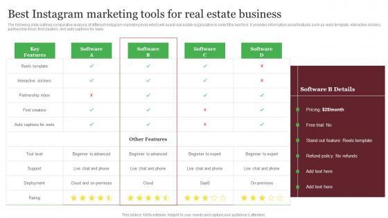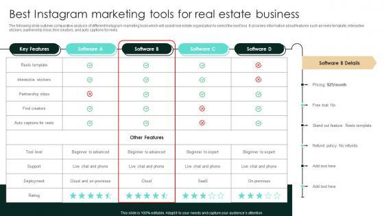 The following slide outlines comparative analysis of different Instagram marketing tools which will assist real estate organization to select the best tool. It provides information about features such as reels template, interactive stickers, partnership inbox, find creators, and auto captions for reels. Want to ace your presentation in front of a live audience Our Best Instagram Marketing Tools For Real Estate Business Strategic Real Estate Rules Pdf can help you do that by engaging all the users towards you. Slidegeeks experts have put their efforts and expertise into creating these impeccable powerpoint presentations so that you can communicate your ideas clearly. Moreover, all the templates are customizable, and easy-to-edit and downloadable. Use these for both personal and commercial use. The following slide outlines comparative analysis of different Instagram marketing tools which will assist real estate organization to select the best tool. It provides information about features such as reels template, interactive stickers, partnership inbox, find creators, and auto captions for reels.