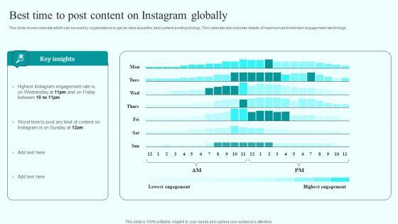 This slide shows calendar which can be used by organizations to get an idea about the best content posting timings. This calendar also includes details of maximum and minimum engagement rate timings. Boost your pitch with our creative Best Time To Post Content On Instagram Globally Social Media Marketing To Enhance MKT SS V. Deliver an awe-inspiring pitch that will mesmerize everyone. Using these presentation templates you will surely catch everyones attention. You can browse the ppts collection on our website. We have researchers who are experts at creating the right content for the templates. So you do not have to invest time in any additional work. Just grab the template now and use them. This slide shows calendar which can be used by organizations to get an idea about the best content posting timings. This calendar also includes details of maximum and minimum engagement rate timings.