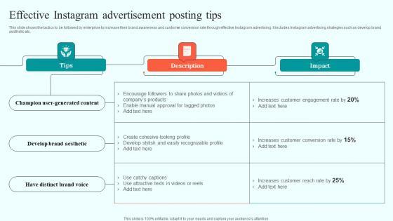 This slide shows the tactics to be followed by enterprise to increase their brand awareness and customer conversion rate through effective Instagram advertising. It includes Instagram advertising strategies such as develop brand aesthetic etc. Slidegeeks is here to make your presentations a breeze with Effective Instagram Advertisement Posting Tips Online Advertising Solutions Diagrams Pdf With our easy-to-use and customizable templates, you can focus on delivering your ideas rather than worrying about formatting. With a variety of designs to choose from, you are sure to find one that suits your needs. And with animations and unique photos, illustrations, and fonts, you can make your presentation pop. So whether you are giving a sales pitch or presenting to the board, make sure to check out Slidegeeks first. This slide shows the tactics to be followed by enterprise to increase their brand awareness and customer conversion rate through effective Instagram advertising. It includes Instagram advertising strategies such as develop brand aesthetic etc.