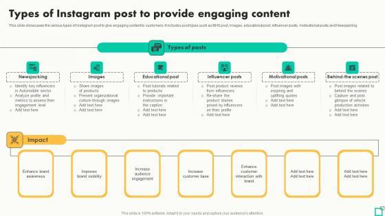 This slide showcases the various types of Instagram post to give engaging content to customers. It includes post types such as BHS post, images, educational post, influencer posts, motivational posts and Newsjacking.Present like a pro with Types Of Instagram Post To Provide Engaging Content Regional Marketing Plan To Boost Sales MKT SS. Create beautiful presentations together with your team, using our easy-to-use presentation slides. Share your ideas in real-time and make changes on the fly by downloading our templates. So whether you are in the office, on the go, or in a remote location, you can stay in sync with your team and present your ideas with confidence. With Slidegeeks presentation got a whole lot easier. Grab these presentations today. This slide showcases the various types of Instagram post to give engaging content to customers. It includes post types such as BHS post, images, educational post, influencer posts, motivational posts and Newsjacking.