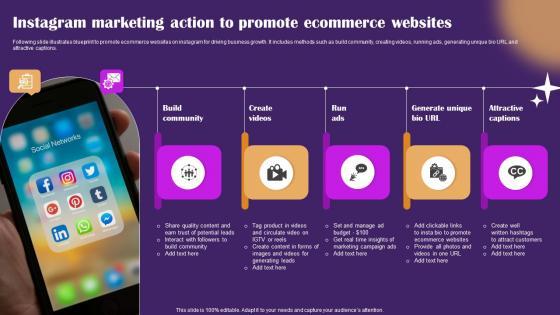 Following slide illustrates blueprint to promote ecommerce websites on instagram for driving business growth. It includes methods such as build community, creating videos, running ads, generating unique bio URL and attractive captions. Pitch your topic with ease and precision using this Instagram Marketing Action To Promote Ecommerce Websites Ppt Slides Example Topics pdf. This layout presents information on Build Community, Creating Videos, Running Ads. It is also available for immediate download and adjustment. So, changes can be made in the color, design, graphics or any other component to create a unique layout. Following slide illustrates blueprint to promote ecommerce websites on instagram for driving business growth. It includes methods such as build community, creating videos, running ads, generating unique bio URL and attractive captions.