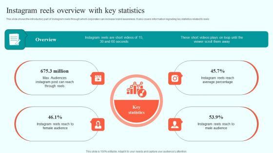 This slide shows the introductory part of Instagram reels through which corporates can increase brand awareness. It also covers information regrading key statistics related to reels. Formulating a presentation can take up a lot of effort and time, so the content and message should always be the primary focus. The visuals of the PowerPoint can enhance the presenters message, so our Instagram Reels Overview Social Media Platform Advertising To Enhance Brand Awareness Microsoft Pdf was created to help save time. Instead of worrying about the design, the presenter can concentrate on the message while our designers work on creating the ideal templates for whatever situation is needed. Slidegeeks has experts for everything from amazing designs to valuable content, we have put everything into Instagram Reels Overview Social Media Platform Advertising To Enhance Brand Awareness Microsoft Pdf This slide shows the introductory part of Instagram reels through which corporates can increase brand awareness. It also covers information regrading key statistics related to reels.