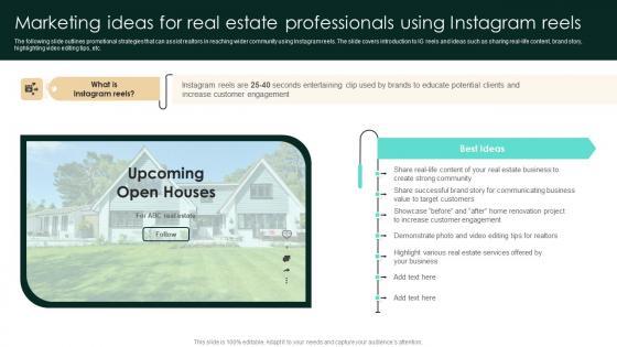 The following slide outlines promotional strategies that can assist realtors in reaching wider community using Instagram reels. The slide covers introduction to IG reels and ideas such as sharing real-life content, brand story, highlighting video editing tips, etc. Take your projects to the next level with our ultimate collection of Marketing Ideas For Real Estate Professionals Using Instagram Reels Strategic Real Estate Formats Pdf Slidegeeks has designed a range of layouts that are perfect for representing task or activity duration, keeping track of all your deadlines at a glance. Tailor these designs to your exact needs and give them a truly corporate look with your own brand colors they well make your projects stand out from the rest. The following slide outlines promotional strategies that can assist realtors in reaching wider community using Instagram reels. The slide covers introduction to IG reels and ideas such as sharing real-life content, brand story, highlighting video editing tips, etc.