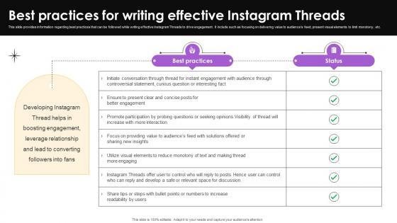This slide provides information regarding best practices that can be followed while writing effective Instagram Threads to drive engagement. It include such as focusing on delivering value to audiences feed, present visual elements to limit monotony, etc. Boost your pitch with our creative Best Practices For Writing Effective Instagram Threads Everything To Know About Instagram Threads AI SS V. Deliver an awe-inspiring pitch that will mesmerize everyone. Using these presentation templates you will surely catch everyones attention. You can browse the ppts collection on our website. We have researchers who are experts at creating the right content for the templates. So you do not have to invest time in any additional work. Just grab the template now and use them. This slide provides information regarding best practices that can be followed while writing effective Instagram Threads to drive engagement. It include such as focusing on delivering value to audiences feed, present visual elements to limit monotony, etc.