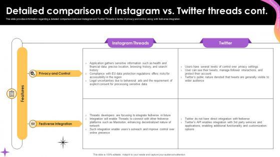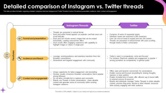 This slide provides information regarding a detailed comparison between Instagram and Twitter Threads in terms of format and presentation, audience, reach, context, and engagement. Slidegeeks is one of the best resources for PowerPoint templates. You can download easily and regulate Detailed Comparison Of Instagram Vs Twitter Threads Everything To Know About Instagram Threads AI SS V for your personal presentations from our wonderful collection. A few clicks is all it takes to discover and get the most relevant and appropriate templates. Use our Templates to add a unique zing and appeal to your presentation and meetings. All the slides are easy to edit and you can use them even for advertisement purposes. This slide provides information regarding a detailed comparison between Instagram and Twitter Threads in terms of format and presentation, audience, reach, context, and engagement.