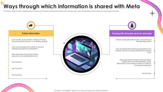 This slide provides information regarding various ways through information is shared with Threads parent company, Meta. Meta collects public as well 3rd party services and users information. Explore a selection of the finest Ways Through Which Information Is Shared With Meta Everything To Know About Instagram Threads AI SS V here. With a plethora of professionally designed and pre-made slide templates, you can quickly and easily find the right one for your upcoming presentation. You can use our Ways Through Which Information Is Shared With Meta Everything To Know About Instagram Threads AI SS V to effectively convey your message to a wider audience. Slidegeeks has done a lot of research before preparing these presentation templates. The content can be personalized and the slides are highly editable. Grab templates today from Slidegeeks. This slide provides information regarding various ways through information is shared with Threads parent company, Meta. Meta collects public as well 3rd party services and users information.