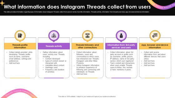 This slide provides information regarding type of information does Instagram Threads collect from users in terms of profile information, Threads activity, information from 3rd party services, app, browser and device information. The best PPT templates are a great way to save time, energy, and resources. Slidegeeks have 100 percent editable powerpoint slides making them incredibly versatile. With these quality presentation templates, you can create a captivating and memorable presentation by combining visually appealing slides and effectively communicating your message. Download What Information Does Instagram Threads Collect Everything To Know About Instagram Threads AI SS V from Slidegeeks and deliver a wonderful presentation. This slide provides information regarding type of information does Instagram Threads collect from users in terms of profile information, Threads activity, information from 3rd party services, app, browser and device information.