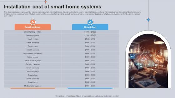 This slide provides an overview of the various systems installed in smart homes. Major smart systems covered are smart lighting systems, thermostats, smart locks, smart doorbells, security systems, motion sensors, smoke detection sensors, water sensors, alarm systems, security cameras, smart speakers, smart displays, smart plugs, robot vacuums, HVAC system, medical alert system. Are you searching for a Installation Cost Of Smart Home Systems Utilizing Smart Appliances IoT SS V that is uncluttered, straightforward, and original Its easy to edit, and you can change the colors to suit your personal or business branding. For a presentation that expresses how much effort you have put in, this template is ideal With all of its features, including tables, diagrams, statistics, and lists, its perfect for a business plan presentation. Make your ideas more appealing with these professional slides. Download Installation Cost Of Smart Home Systems Utilizing Smart Appliances IoT SS V from Slidegeeks today. This slide provides an overview of the various systems installed in smart homes. Major smart systems covered are smart lighting systems, thermostats, smart locks, smart doorbells, security systems, motion sensors, smoke detection sensors, water sensors, alarm systems, security cameras, smart speakers, smart displays, smart plugs, robot vacuums, HVAC system, medical alert system.
