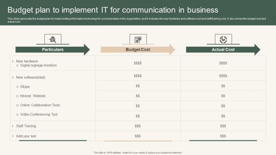 This slide represents the budget plan for implementing information technology for communication in the organization, and it includes the new hardware and software cost and staff training cost. It also shows the budget cost and actual cost. If you are looking for a format to display your unique thoughts, then the professionally designed Budget Plan To Implement Instant Messenger For Internal Business Operations Diagrams Pdf is the one for you. You can use it as a Google Slides template or a PowerPoint template. Incorporate impressive visuals, symbols, images, and other charts. Modify or reorganize the text boxes as you desire. Experiment with shade schemes and font pairings. Alter, share or cooperate with other people on your work. Download Budget Plan To Implement Instant Messenger For Internal Business Operations Diagrams Pdf and find out how to give a successful presentation. Present a perfect display to your team and make your presentation unforgettable. This slide represents the budget plan for implementing information technology for communication in the organization, and it includes the new hardware and software cost and staff training cost. It also shows the budget cost and actual cost.