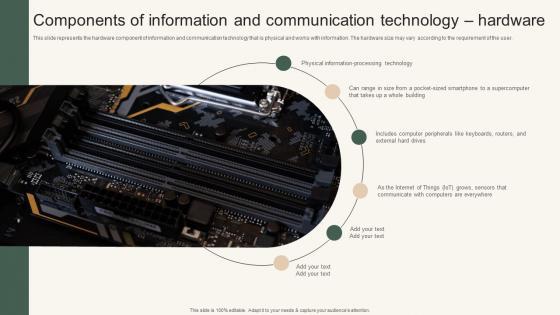 This slide represents the hardware component of information and communication technology that is physical and works with information. The hardware size may vary according to the requirement of the user. Make sure to capture your audiences attention in your business displays with our gratis customizable Components Of Information And Instant Messenger For Internal Business Operations Topics Pdf. These are great for business strategies, office conferences, capital raising or task suggestions. If you desire to acquire more customers for your tech business and ensure they stay satisfied, create your own sales presentation with these plain slides. This slide represents the hardware component of information and communication technology that is physical and works with information. The hardware size may vary according to the requirement of the user.