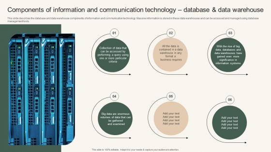 This slide describes the database and data warehouse components of information and communication technology. Massive information is stored in these data warehouses and can be accessed and managed using database management tools. Formulating a presentation can take up a lot of effort and time, so the content and message should always be the primary focus. The visuals of the PowerPoint can enhance the presenters message, so our Components Of Information Instant Messenger For Internal Business Operations Graphics Pdf was created to help save time. Instead of worrying about the design, the presenter can concentrate on the message while our designers work on creating the ideal templates for whatever situation is needed. Slidegeeks has experts for everything from amazing designs to valuable content, we have put everything into Components Of Information Instant Messenger For Internal Business Operations Graphics Pdf This slide describes the database and data warehouse components of information and communication technology. Massive information is stored in these data warehouses and can be accessed and managed using database management tools.