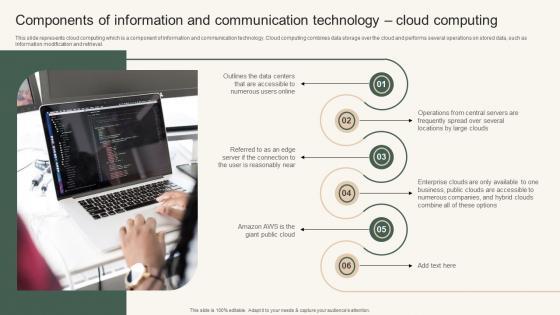 This slide represents cloud computing which is a component of information and communication technology. Cloud computing combines data storage over the cloud and performs several operations on stored data, such as information modification and retrieval. Coming up with a presentation necessitates that the majority of the effort goes into the content and the message you intend to convey. The visuals of a PowerPoint presentation can only be effective if it supplements and supports the story that is being told. Keeping this in mind our experts created Components Of Information Instant Messenger Internal Business Operations Introduction Pdf to reduce the time that goes into designing the presentation. This way, you can concentrate on the message while our designers take care of providing you with the right template for the situation. This slide represents cloud computing which is a component of information and communication technology. Cloud computing combines data storage over the cloud and performs several operations on stored data, such as information modification and retrieval.