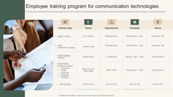 This slide represents the employee training program for new communication technologies, and it includes the type of training, trainer name, departments name, schedule, and venue of the training. This modern and well arranged Employee Training Program For Instant Messenger For Internal Business Operations Microsoft Pdf provides lots of creative possibilities. It is very simple to customize and edit with the Powerpoint Software. Just drag and drop your pictures into the shapes. All facets of this template can be edited with Powerpoint, no extra software is necessary. Add your own material, put your images in the places assigned for them, adjust the colors, and then you can show your slides to the world, with an animated slide included. This slide represents the employee training program for new communication technologies, and it includes the type of training, trainer name, departments name, schedule, and venue of the training.